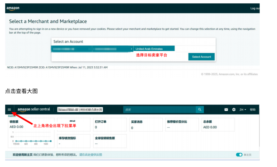 STEP1:登录亚马逊卖家后台→选择【目标卖家平台】→左上角将会出现下拉菜单,选择阿联酋