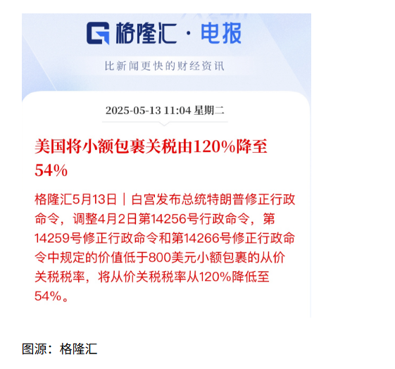 其中除了昨天大家讨论的30%基础关税消息以外,本行政令还公布了关于800美元小额变动消息:税由120%降至54%,每件小额邮递物品100美元从量关税维持不变。政策将于5 月 14 日凌晨 12:01(美国时间)正式生效。