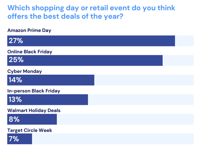 27%的消费者认为亚马逊Prime Day比黑五更划算,几乎与传统黑五持平(25%)。黑五不再是“11月的独角戏”,而是一场持续两个月的“折扣接力赛”。