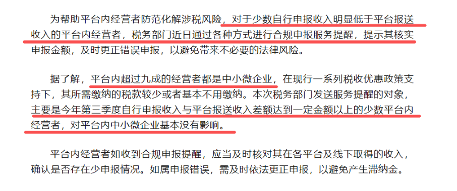 01多地电商卖家收到税务提醒10月26日开始,据卖家透露,广东、福建、浙江等多地的卖家收到来自税务部门的短信提醒,称其三季度自行申报的增值税收入低于互联网平台报送金额,需及时核对更正。与此同时,今天上午国家税务总局发布最新通知提醒“未申报、少申报的平台内经营者请及时进行核实更正。”