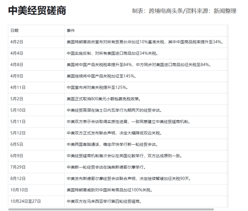 02后续关注焦点此外,10月30日至11月1日,韩国庆州将举行亚太经合组织(APEC)第三十二次领导人非正式会议,中美双方最高领导人都将确定访问韩国。届时,中美两国元首是否会晤已成为全球资本市场的关注焦点。回顾今年以来的中美经贸博弈,挑战始终存在:自5月日内瓦经贸会谈后,美方对华海事物流和造船业的301调查、关税暂停期到期风险、稀土出口管制等问题接连出现,全球两大经济体的经贸关系数次引发市场震荡。此次吉隆坡磋商的突破性进展,无疑为双边关系注入了积极动能,而APEC会议上的元首互动与贸易协议细节,或将为中美经贸未来走向定下关键基调。在中美经贸关系的反复博弈中,跨境卖家既面临政策不确定性的挑战,也迎来市场调整与布局的新机遇。