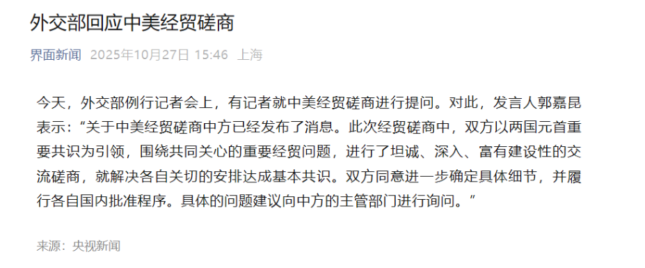 经过多轮博弈,中美经贸关系又迎来最新转折点。10月25日至26日,中美经贸中美双方牵头人在吉隆坡举行中美经贸磋商。美方明确表示“不再考虑”对中国加征100%的关税,中美经贸紧张局势释放缓和信号。